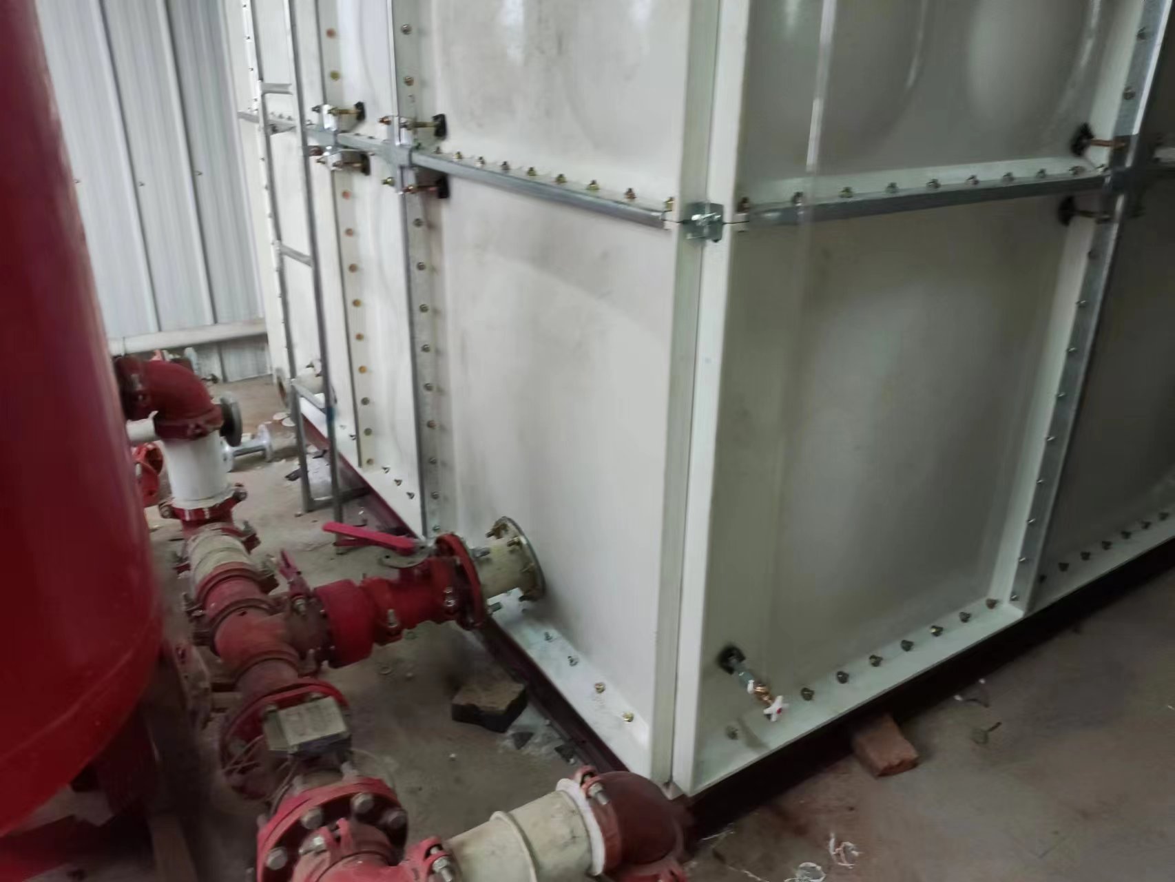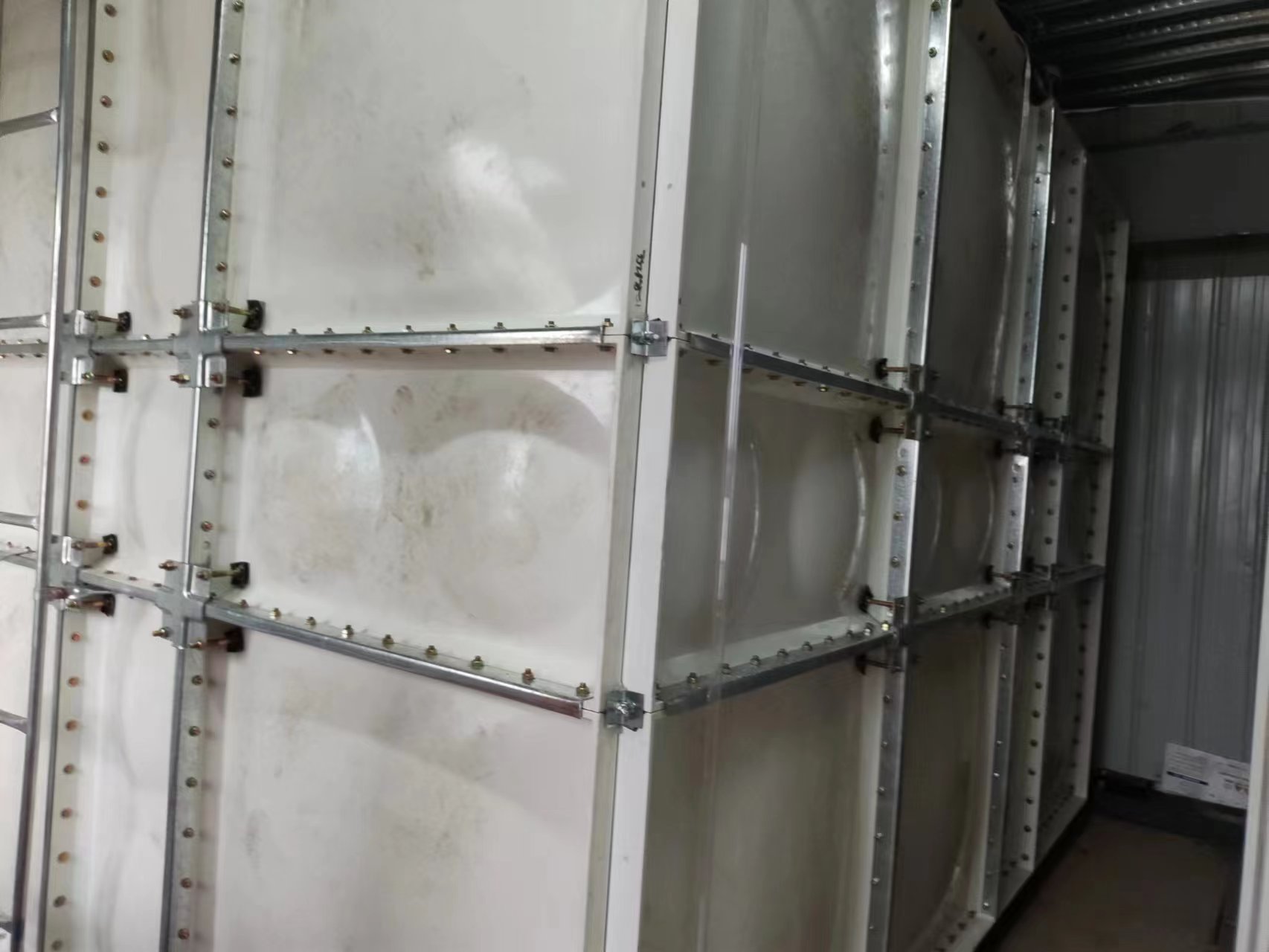 我司承接的山東省德州市平原縣紡興纖維廠地震災(zāi)后重建項(xiàng)目,21.9立方SMC玻璃鋼消防水箱已經(jīng)安裝試水完成。SMC組合式玻璃鋼水箱是一種普遍采用的儲(chǔ)水方式。是由SMC單元板現(xiàn)場組裝而成的一種水箱。單元板用SMC(sheet moulding compound)片材在高溫高壓下模壓成型,水箱內(nèi)采用加強(qiáng)式支撐,其鋼配件選用熱鍍鋅件和不銹鋼件均可。板塊厚度的選取依據(jù)板塊所受的壓力和所處的位置。有5mm、8mm、10mm、12mm、14mm、16mm等。