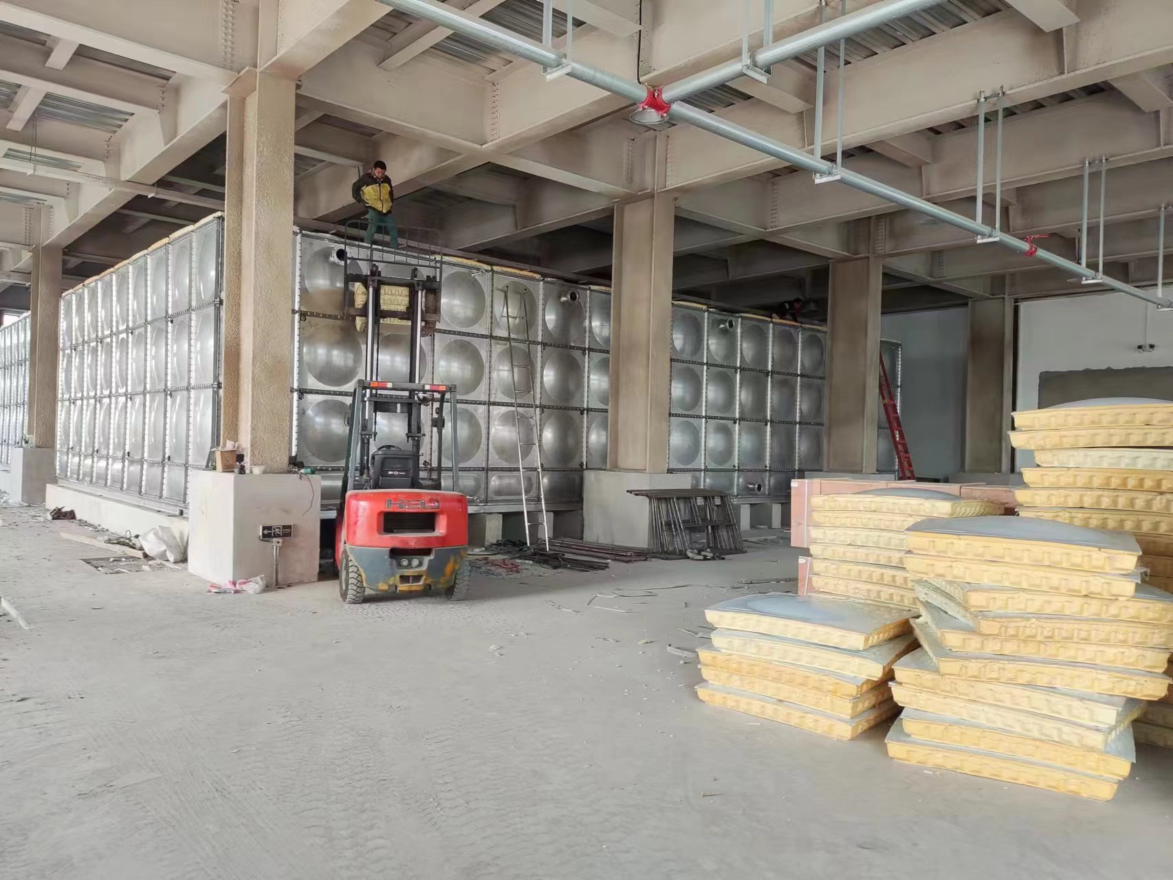 我司承接的河北省唐山市曹妃甸區曹妃甸熱力公司項目的熱鍍鋅鋼板保溫熱水箱已安裝試水完畢。此水箱為熱鍍鋅鋼板材質,熱鍍鋅水箱經熱鍍鋅,使水箱板面形成致密鍍鋅層,與鋼板界面離子之間互相滲透,混合形成擴散層,加大了鍍鋅面的附著強度。鍍鋅面光滑,容易清洗,且耐腐蝕,鋼板組裝結構,不易變形、抗震性強、抗沖擊力大,通過長時間的使用,顯示出好的效果并得到用戶好評。