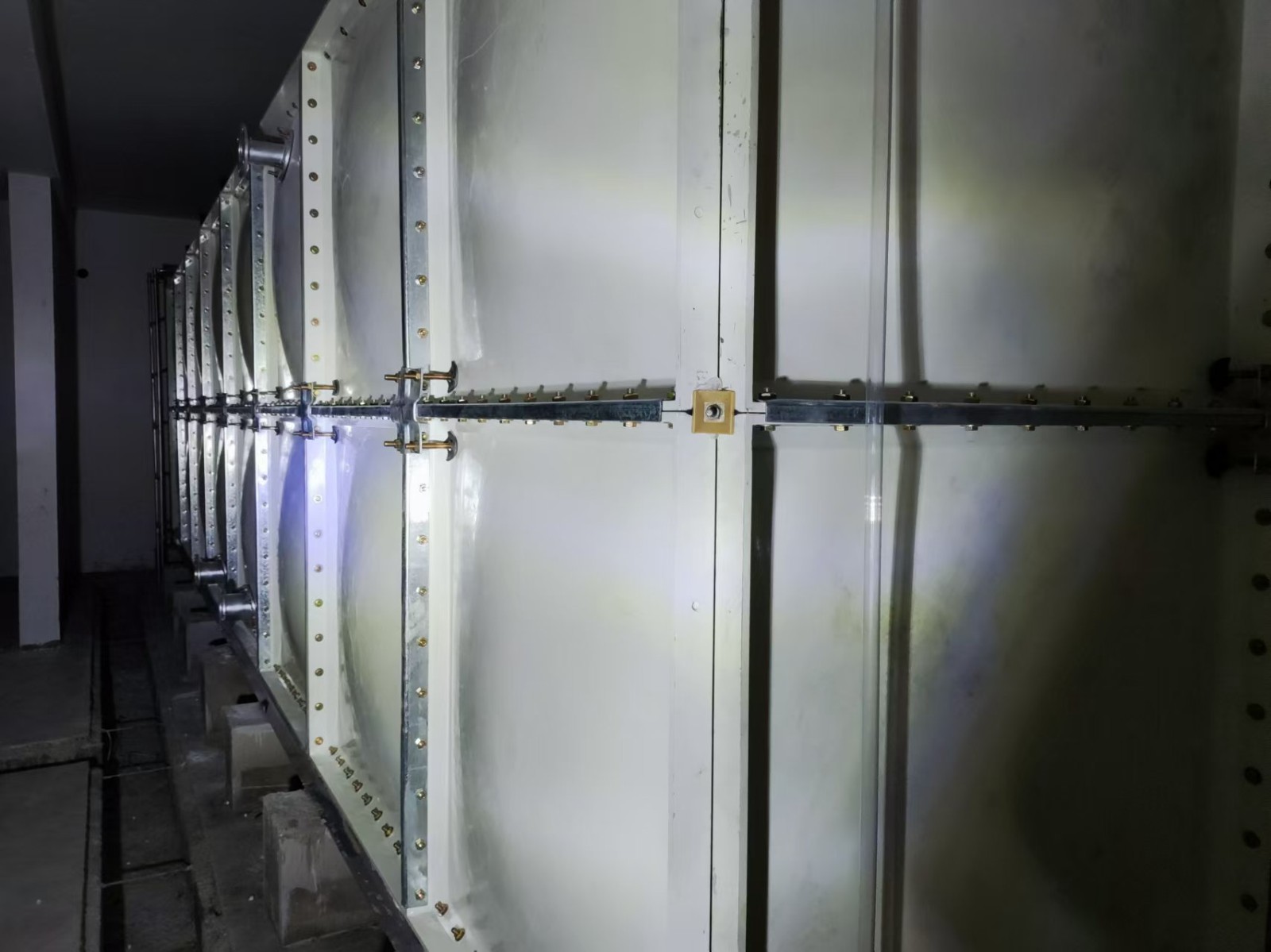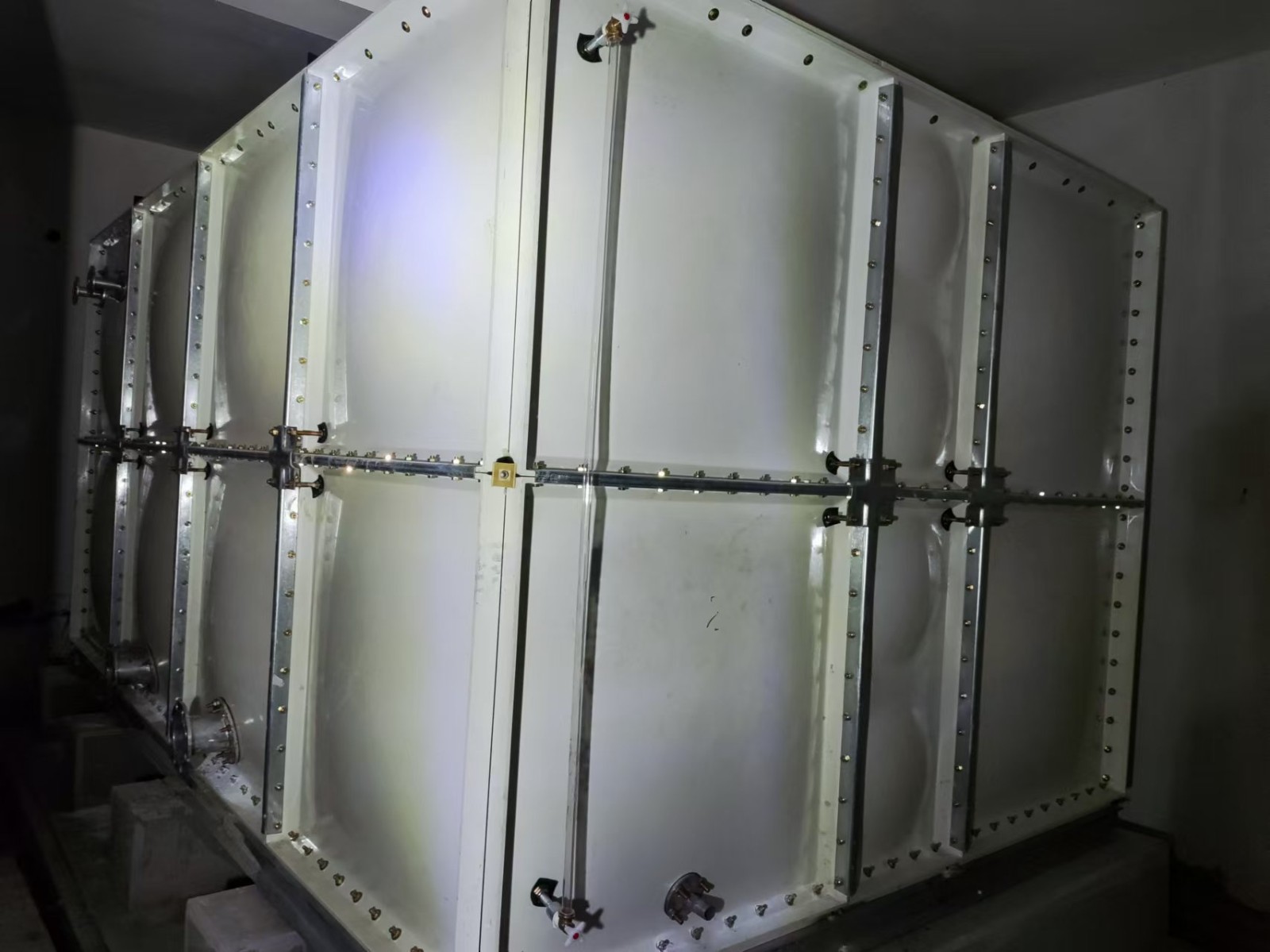 玻璃鋼水箱是由SMC模壓板塊、密封材料、金屬結(jié)構(gòu)件及配管系統(tǒng)現(xiàn)場組裝而成。給設(shè)計和施工帶來極大方便。一般水箱按標(biāo)準(zhǔn)設(shè)計,特殊水箱需要專門設(shè)計。可根據(jù)用戶需要組裝0.125-1500立方米的水箱。該密封帶耐水、彈性大、變型小,緊固密封。水箱整體強(qiáng)度高,不易滲漏,不易變形,保養(yǎng)、檢修方便。