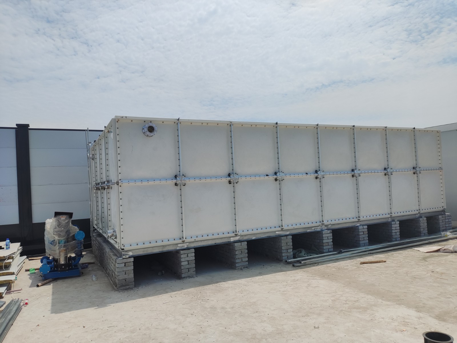 我司承接的山東省濟寧市濟南城建項目,玻璃鋼消防水箱已經(jīng)安裝完成。玻璃鋼保溫水箱是由SMC模壓板塊、密封材料、金屬結(jié)構(gòu)件及配管系統(tǒng)現(xiàn)場組裝而成。可根據(jù)用戶需要靈活組裝,若原有水箱需要更換,不需要改造房屋,適應(yīng)性很強。水箱整體強度高,無滲漏,無變行,保養(yǎng),檢修方便。